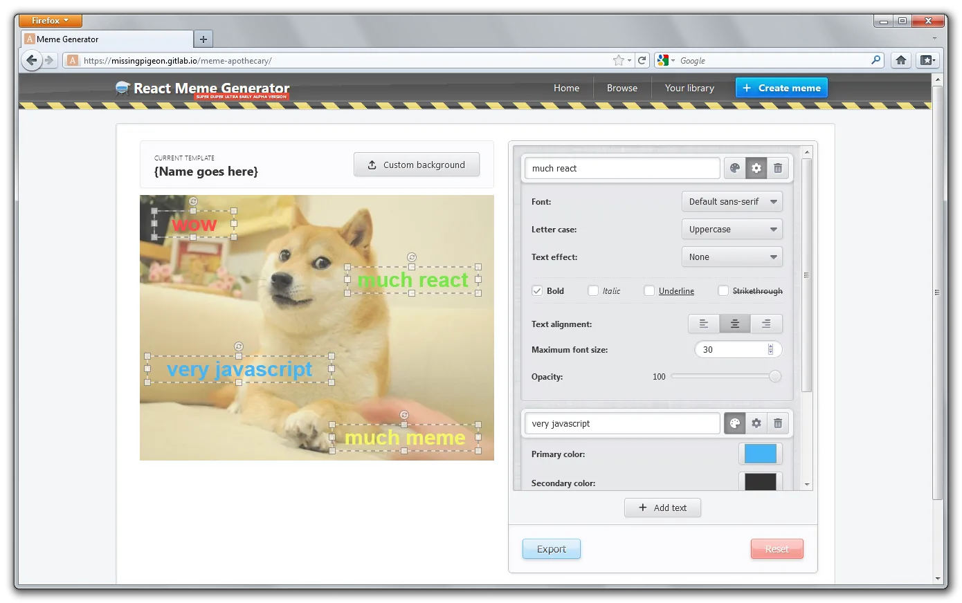 Meme Apothecary is a meme maker and my very first React project, made while learning the library. The user can upload a background image; add, resize, move, rotate, style and edit arbitrary text; and export the result to an image file. The project is currently an MVP, and I plan to do a complete rewrite in TypeScript and add more advanced features, such as fully custom image dimensions (currently limited to 512px for the width), adding and editing clip arts, and sharing.
